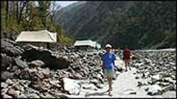 Travelling down the river with the mountains gleaming in the clean, thin air, the sun burning our faces and the cold water on the floor of the rafts freezing the toes is an experience to savour. We got used to the cold, and to the hot sun - the expedition food was ample good fare, ranging from Indian cuisine for the main meal at the end of the day to pasta, cold cuts, eggs and sandwiches for breakfast and lunch. We slept in waterproof tents on karrimats, waking upto bed-tea each morning, a great way to start a new day in the mountains. We washed in streams, toilets were the great outdoors, toilet paper was carefully burnt. On our third day on the river, we enter the Zanskar gorge, where the river, in an awesome display of force, has cut its way between sheer cliffs towering 2,500 to 3,000 feet above the water. By now, we have learnt the jargon of reading the river from our guides, a team that has run all major Himalayan rivers in the country. We learn about eddy-lines, and boils, which working together can flip a raft in seconds - we learn highside commands to deal with such situations and feel pretty smug with our new-found skills. Our guides take us for a hike into a nearby village where we get to see a day in the life of a Zanskari household. We pass Chilling, where they are trying to build a road into the Zanskar gorge. If ever completed, it will be a major feat of engineering. Chilling is famous for its copper work and we pick up a few souvenirs. After crossing our last major rapid on the Zanskar near Chilling, we head onto the confluence at Nimu, where we bob into the mighty Indus river. Although the Indus is already over 500kms long and away from its source near Kailash-Mansarovar in Tibet, the Zanskar is its first main tributary. We raft on past a huge rapid onto Saspul, where the rafts beach and the gear is unloaded. Truly, a trip of a lifetime, is over. Rafts and gear are packed and dried while we eat lunch before loading into waiting vehicles. We drive into Leh by late afternoon for a welcome shower and a walk into town. The evening is well-spent at an outdoor restaurant bar with tales of other trips and rivers, planning future adventures. After the handshakes, we bid goodbye to each other, amidst memories of Zanskar, the last truly Lost Horizon of our shrinking planet.