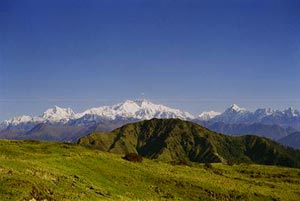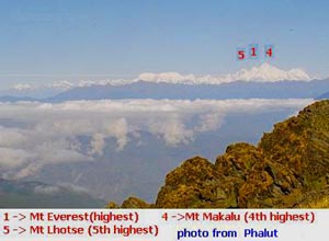 The next day began with glorious views of Kanchendzonga with the first rays of sun adorning it. With a 170-degree breath-taking view of Nepal and Sikkim Himalayas, one can see Mt Everest (highest), Mt Kanchendzonga (3rd highest), Mt Makalu (4th highest), Mt Lhotse (5th highest), Pandim, Kumbhkarn, Kabru, Dome, Machchapuchare from Sandakphu. The Kanchendzonga, Kumbhkarn and Pandim range together are referred to as "sleeping Shiva" or "sleeping Buddha".