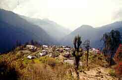 At Geyzing, we changed jeeps to complete the last 24 kms on an unmetalled, but relatively comfortable road, replete with breathtaking views of mostly virgin West Sikkim. En route we passed Pelling, an upcoming tourist attraction, being developed with all the trappings of luxury and comfort at the expense of retaining it's natural splendour. Lamentably enough, Pelling had fallen victim to the creation of yet another honeymooner's paradise.