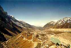 Goecha-La (in Tibetan, " La " means mountain pass) at about 17,000 feet is about 6 kms from Smiti.On 16th morning, I set off with my guide for the final walk up.Within half an hour we were beyond the tree line.With vast mountain tracts strewn with rocks and boulders and desolate stretches of harsh barren landscapes of sandy terrain, I was reminded of the fact that the Himalays once lay in the ocean. All the glacial beds that I walked across were nothing but stretches of sand, white or greyish white in colour. It is impossible to describe the still silence and the ethereal ambience of the high Himalayas.