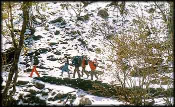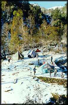 Tehri (600 m) - Chirbatia (2,134 m, 55 km) - Bishnoi Hill (2,896 m, 20 km) - Panwali Kantha (3,048, 20 km)- Badhani Tal (2,743 m, 20 km) - Mankha Khal (2,995m, 8 km) - Phatta (1,829m, 10 km). At Chirbatia, there is a forest rest house. For all other points enroute one will to have depend on shepherd's huts, and on one's own tents. There is a PWD inspection house at Phata, which is a big village. >From Phata one can take a bus for Gaurikund and visit Kedarnath, or take a bus to Rishikesh.