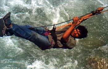 Our next adventure was Overhand Crawling - one good reason to return to Mahuli every year. The river of dreams is in full flow from mid July to mid August. What we did was to tie each end of a rope to each side of the river. We harnessed ourselves and clipped on to the rope upside down. While the raindrops fell on our faces, we pulled ourselves over the gushing waters clinging to the rope until we reached the other side. It was fun and thrilling. I remained suspended on the rope while hanging in the middle of the river. The level of the rope was just right for the river to tickle my back. River crossing is a technical skill, but sheer thrill if you are smart with knots and ropes.