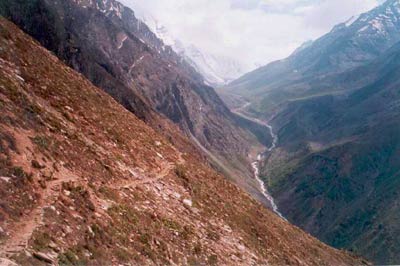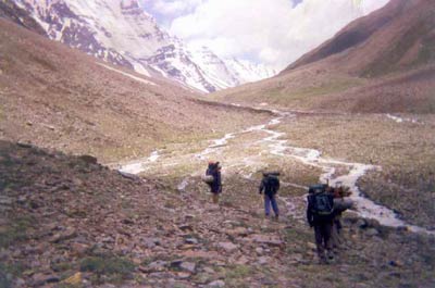 A large group of people pitch tent, 20-minutes upstream. They had not crossed us, so they must have come from the other side, from our destination Chitkul. We hurry across, and are not surprised to see it is a single foreigner with 8-10 porters. He turns out to be Garry Weare, the Lonely Planet correspondent, doing an update. "There is plenty of snow on the pass," he says. "We had to cut our way down. Just retrace our steps, and you will be fine." Providence is indeed, on our side. "Head for Chitkul, should take you nine hours," we are told. Four hours to the base of the pass, one for the climb, and four hours for the walk down to Chitkul.