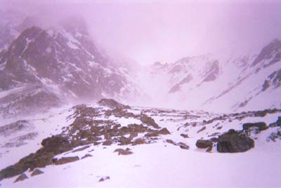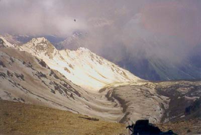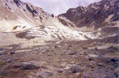 Crossing the snowline, we enter a steep gorge, littered with smashed rocks and boulders. A local had been killed here, when a loose rock struck him, last season or the one before. The unasked questions were answered in a moment we heard the unmistakable sounds of rocks cracking off the mountainside, and with a series of sickening noises, four headed towards us, and all had to take evasive action. We could smell the flint as they whizzed past like giant crazy balls. We knew that as long as we were in this gorge, we were vulnerable. Push them tired feet, dammit! Walking up may be strenuous, but down a mountainside is infinitely more painful on the feet.
