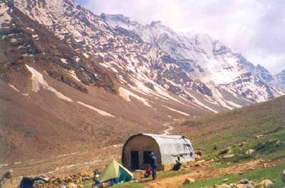 On day five, we laze, waiting for the sunlight to find our tent. We start after 10.00 am, walking along the nallah, reaching Lalanti (4200 m/13,776 ft) at 1.30 pm. One has to be careful en route, though. If you follow the footpath (as it leaves the stream) you will be stuck on the higher reaches of the surrounding peaks. Two of us made that mistake, and had to slide down to safety, minus the seat of our pants.