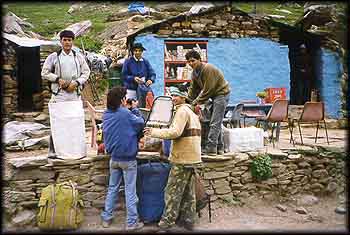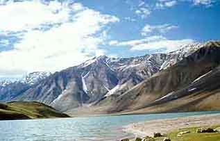 Actually, Batal is geographically a kind of funnel for the wind that screams through the KunZum La Pass. And at nearly 15,000 feet, turbulent and fluctuating air pressures determine this unique phenomena. Dinner at Batal. No prizes for guessing the menu ! Sleep is not quite peaceful, with wild dogs constantly active at the campsite. 7.00 a.m., July 22nd: An air of anticipation and excitement. Today we finally trek to Chandratal Lake. We quickly get cracking and soon cross the precarious rope bridge to enter Spiti. A small temple is situated at the end of the bridge. It is rumoured that accidents on the bridge have practically stopped after the presiding deity was constructed. Across the bridge is yet another world all together. Sharp mountainsides with grey stones hanging loosely mark the steep ascent. Out of the blue we sometimes come across verdant meadows carpeted with alpine flowers. And then its back to the barrenness. With the river far below, the trail is confusing and quite unclear. It is an endless walk that takes its toll on the legs. Finally a series of meadows appear. Each time one meadow appears, one expects the Chandratal in the subsequent glacial bowl. But for a long time the lake remains elusive. I finally clamour up a mountainside and discover a beautiful moon shaped lake with white peaks closely around it. It looks like many of the photographs of Chandratal that I've seen. But somehow the lake seems much smaller. I send off a porter to explore around and he finally locates the real Chandratal. We accompany him and enter a beautiful meadow with a joyous stream coming out of a huge moon shaped lake. Over 20 peaks crown it on all sides, reflecting magically and creating that fabled upside-down world of Chandratal which so many trekkers dream of. The feet are no longer tired. Delhi is totally forgotten, a pretty campsite is set up, a ravenous appetite is catered to and the camera is clicking roll after roll. The intoxicating feeling of exhilaration sets in and takes us into another world. I recall the words of a close trekking partner whom I lost during a trek in Sikkim. "Why is it that the more remote and inaccessible a place is, the greater its magic ?" We begin, the next day, a journey back to Gramphoo and over the Rohtang Pass and into Manali. The same route, but I could describe it again, for no matter how many times you walk that trail, each time it seems new. But next time, another trek, on another route, in the same old timeless drama of the Himalayas.