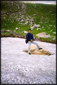 It was my sheer fear of the civilised terror of Lutyen's Delhi that drove me across the Rohtang Pass in the Pir Panjal range through the green and treeless wonder of the high altitude desolateness of Lahaul and into the barren moonscapes of enigmatic Spiti. At around 14,500 feet, satiated by the psychological distance from New Delhi, I reached the Chandratal Lake, aptly named, as it is in fact, moon shaped. For theorists who proclaim that in trekking, unlike other kinds of travel, the journey is itself a destination, Chandratal has a beautifully blatant way of disagreeing. In a sly way, this heavenly place makes it clear what a high point of a trek really means. I have returned to Lutyen's Delhi and even while I drive through the polluted fumes of development, my eyes momentarily close and play back the memory of a path on the green bank of a turbulent river, across the wonder of more than twenty glaciers, myriad clouds that block the trail with an ephemeral quality all their own ...and then a mirrored sheen of peace, with more than twenty snow clad soldiers protectively encircling the magic called Chandratal. July 19, 1998: Rohtang Pass ( 13, 500 ft ) really previewed to me what was coming. It was the month of July in the year '98 and yet mist wrapped snowfields and glaciers completely covered the expansive pass. |