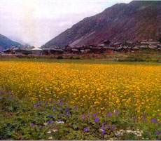 In winter, the temperature can drop below freezing point when heavy woollens are required. The summer temperature can touch 32oC and light woollens/cottons are recommended. Places of interest in and around Sarahan Bhimkali Temple Complex This is Sarahan's main focus and its weathered walls enclose approximately an acre of temples, old residential quarters, courtyards and a small recently created museum. In the classical 'Shikhara style there is a temple of Lord Narasingh. Over a deep well is the shrine of Bhairon and built about a century ago, is the temple of Lord Raghunath. The tall towerlike structure and unusual roof lines of the two Bhimakali temples dominate the complex. The centuries-old original temple is now locked and in the one built in 1943, the goddess Bhimkali is portrayed both as a maiden ansd as a woman. A host of other deities flank her images. Dressed-stone placed in interlocking wooden beams have made the temple an architectural showpiece, which is enhanced by a wealth of wood carving. The are some delightful walks and interesting excursions. A few kilometres short of Sarahan is the quaint village of Ranwin from where a tunnel is said to lead to Sarahan. Its temple holds an ancient sacred text. Behind the Bhimkali temple is the Bashal peak and on the way is the cave where the legendary devote Bhimagiri is said to have lived. There is also a pheasant breeding centre at Sarahan. Rampur Before Sarahan on the banks of the river Sutlej, Rampur (1006m) is an important commercial centre where a variety of goods from Tibet are traded - especially during the Lavi fair held every November. These includes livestock, wool, shawls, blankets and dry fruit. Its old Hindi and Buddhist shrines include the Raghunath temple, the Ayodhya temple, the Narasingh temple and Dumgir Budh temple - the last has a large prayer wheel and holds important scriptures. In an interesting mix of colonial and traditional styles, the Padam Palace is one of Rampur's major attractions. 18 km from Rampur is the unique 'Sun temple' at Nirath. Nattnagar, another historical site, is close to Rampur. Gaure (37km) This is a picturesque village well known for it's delicious apples. Sangla Valley