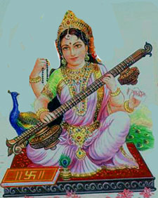 Om Saraswatiye Vidmahe Brahmaputriye Dhimahi Tanno Devi Prachodayat Usually depicted standing or seated on a fully blossomed white lotus, she is simplicity and beauty personified. Clad in white, she rides a white swan that symbolises Sattwa Guna or purity and discrimination. The lotus is a reminder of her being rooted in Supreme Reality with Supreme Knowledge at her command. Her smiling face of love and compassion is said to resemble the full moon. The absence of colour and ornamentation, other than the pearls of wisdom she wears, represents her rejection of the superfluous and her freedom from all but the very essence. The swan she chooses to use as her vahan or mount is the power of discrimination, the ability to separate milk from water. Sri Saraswati chooses the swan, implying the need for constancy, fearlessness, perfect discrimination to acquire knowledge of the Real. The peacock is depicted sitting beside her, waiting to serve Her. The peacock represents the arts that she patronises but is also is a reminder of the unpredictability of the mind, with its many moods, easily influenced.