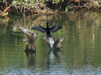 All the trees and shrubs were heavily laden with these avian creatures and the whole forests of acacia looked white at the tops. Some of these birds are breeding species and come from distant North Europe, Russia and also from the northern parts of India, to avoid the chilly winter. The congregation of these migratory birds has been happening in Vedanthangal from time immemorial. Even though these birds face many obstacles, they never fail to turn up here at this time of year. Some of these species are resident like painted storks, pond herons, little egrets. Most of these birds are gregarious in nature. On the same tree, one can see painted storks as well as open-billed storks and pelicans roosting happily. They were all busy building their nests and interacting with each other. They feed on the fishes, small snakes, snails etc that infest the water of the pond that surrounds them. They are continually chattering noisily. They hop from one tree to the other, swoop down to the water, and take away their prized catch to the treetops where they enjoy their meal unhurried and undisturbed, for the most part. The grey herons and the great white egrets are loners and found in solitude. Their majestic figures standing on the overhung branches over the water are really a feast for the eyes. The cormorants, black in colour, and darters with black body and orangeneck, popularly known as snakebirds, are very fond of water. Often they swim on the water and dip their heads to pick-up a fish or two.