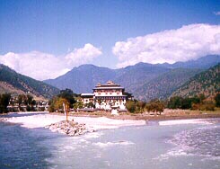 Onwards to Bumthang. Ihad heard about the exotic valley of Bumthang and it's early November festival from the locals when I first stepped into Bhutan after holidaying for 10 days in Sikkim. I had heard that it is an enchanting place not frequented by Indians because of it's remoteness. So, when Jigme and his colleagues processed my papers and arranged for my trip to Bumthang in a pickup van that was carrying luggage for some foreign tourists, the last doubts related to lack of finance began dissipating. Finally, the wandering bug in me took over and I decided to venture into a region where few Indian tourists go... The road went through a wide and immensely beautiful valley. The farmers were returning from their day's work and laughed and waved at us. An enchanting stream escorted us for a few kms till we reached Jakar, the main township in Bumthang and the seat of administration. Because of the four-day festival at Jampa Lhakhang, foreigners occupied all the few good lodges in the valley. I didn't see a single Indian tourist in Bumthang during my stay there. I checked into a room above a provision store paying 110 Ngultrums a night (equivalent to the Indian rupee). It was the only motel in town and my home for the next three nights as I discovered paradise on earth. That night in sub-zero temperatures, I slept in a room that was damp and cold and dug deep into my sleeping bag for warmth. Bumthang valley, like Paro valley, is an enchanting valley that is sparsely populated, with the shallow, emerald green Bumthang river going right through it.