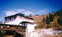 From Chendebji to Trongsa, the distance is 42 kms. The valley narrowed and the Mangde Chu river became a silver streak flowing hundreds of feet below the road. Jigme puffed his cigarette and announced, "For the next 20-25 kms, this gorge will remain deep and narrow. Vehicles that have fallen here have tumbled straight down to the valley floor below as it's a sheer drop and there is nothing to stop the fall." Seeing my nervousness, he said reassuringly, "Don't worry, I'm sure one never feels a thing." He also enlightened me that the Trongsa region is infested with snakes during the monsoons! 20 kms from Trongsa, we got our first enchanting view of the Trongsa Dzong clinging desperately to the cliff side across the gorge. The small township of Trongsa is scattered along the slopes. It took us an hour more to reach Trongsa. Bumthang was 68 kms away. It was 2 p.m. After an hour's halt, we proceeded ahead.